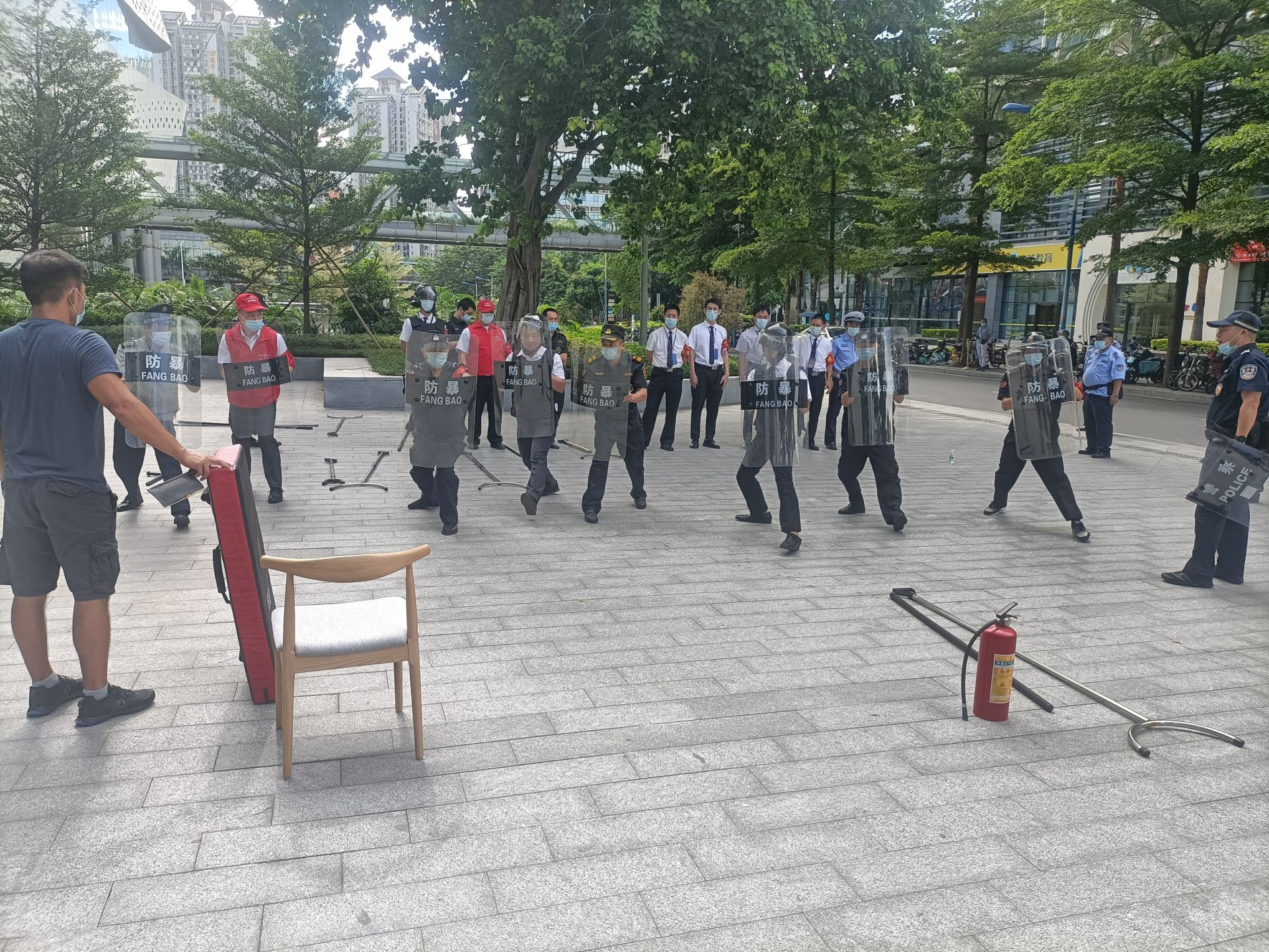 随后开展了多次反恐应急实战演练,参训保安队员从实战中掌握盾牌、钢叉、长棍、防刺服等装备的使用技巧,有效地提高了自身的反恐应急能力。