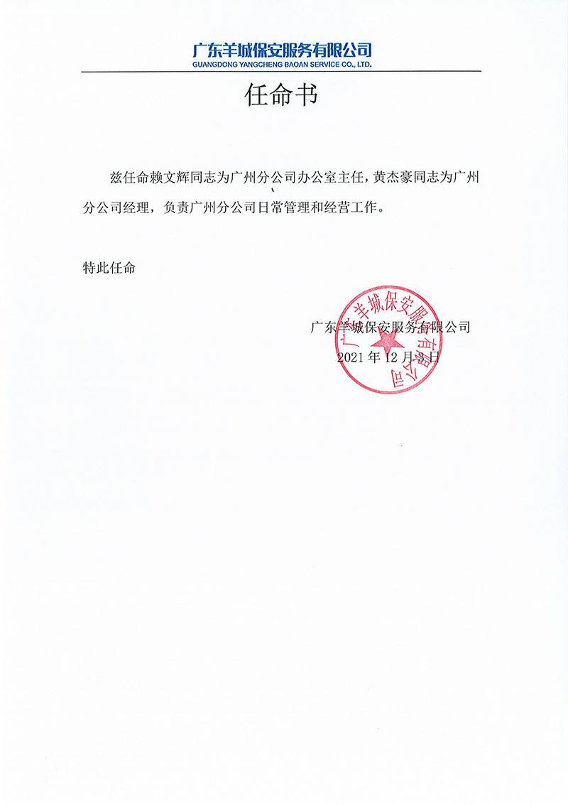 呼和浩特海辰数据智能分析有限公司关于黄杰豪与赖文辉的任命书正式通知